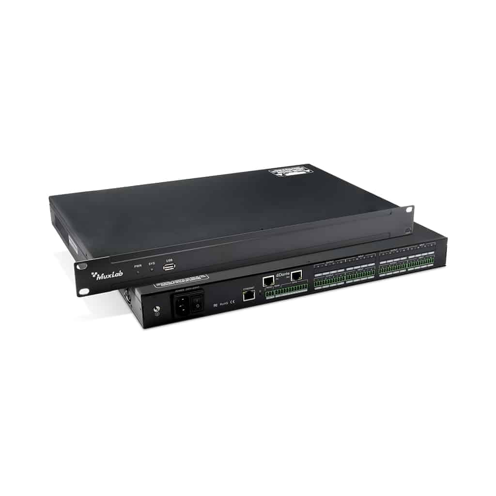 Avec son écosystème Dante complet, MuxLab propose une approche globale couvrant l’ensemble de la chaîne audio : transmission, conversion, traitement, amplification et diffusion.