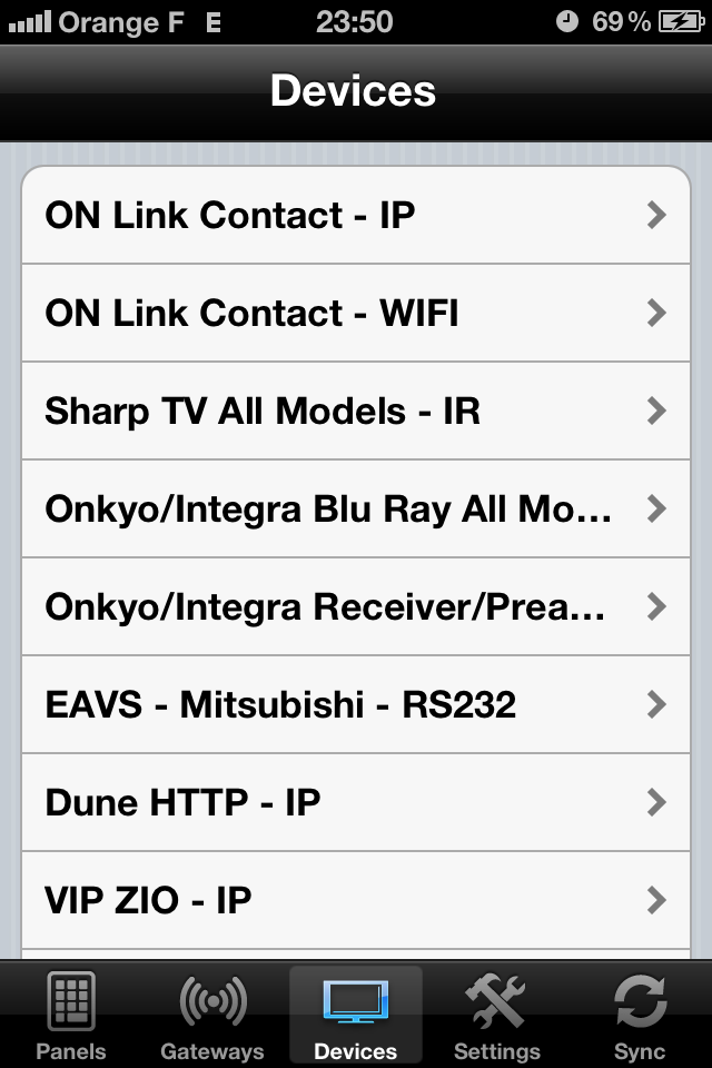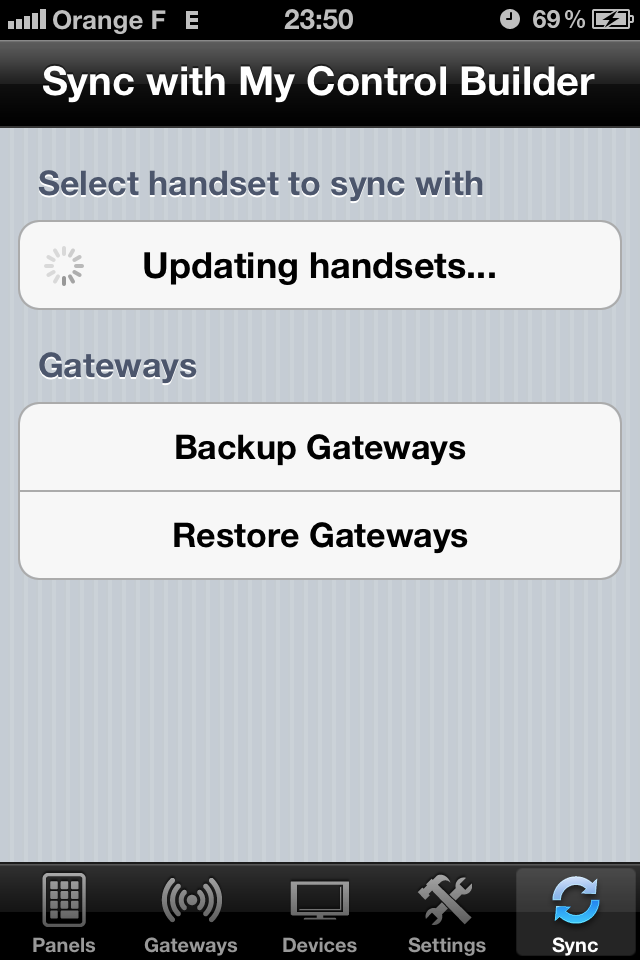 Après avoir lancé l’application, il faut récupérer l’interface pour la stocker dans l’iPhone. Cinq onglets sont disposés en bas de l’écran. C’est le dernier, « Sync », qu’il faut choisir. En haut de l’écran apparaissent les interfaces disponibles (les « handsets ») dans un format supporté par l’iPhone. On sélectionne celle de son choix et on patiente le temps qu’elle soit récupérée, environ 20 secondes la première fois.