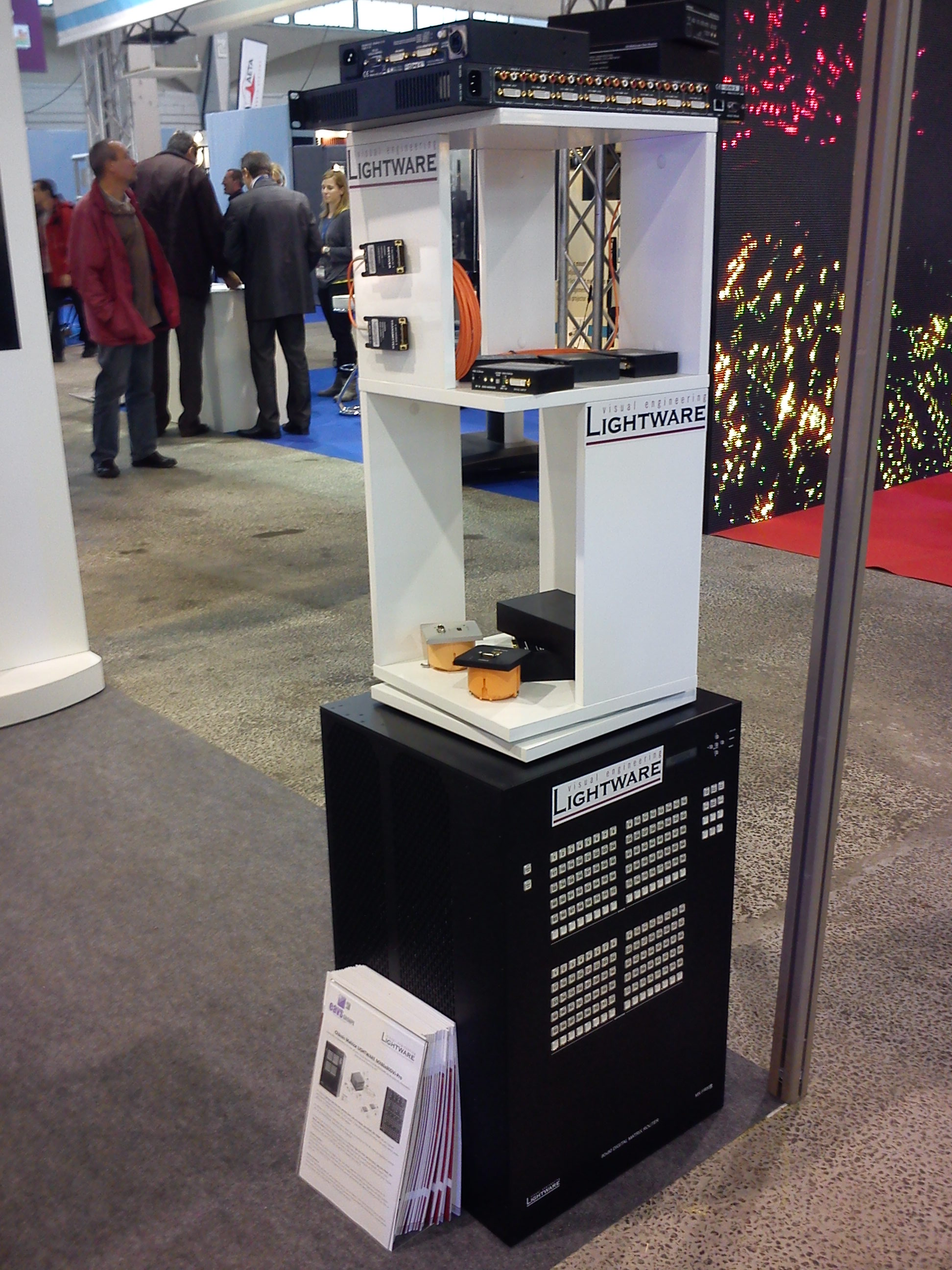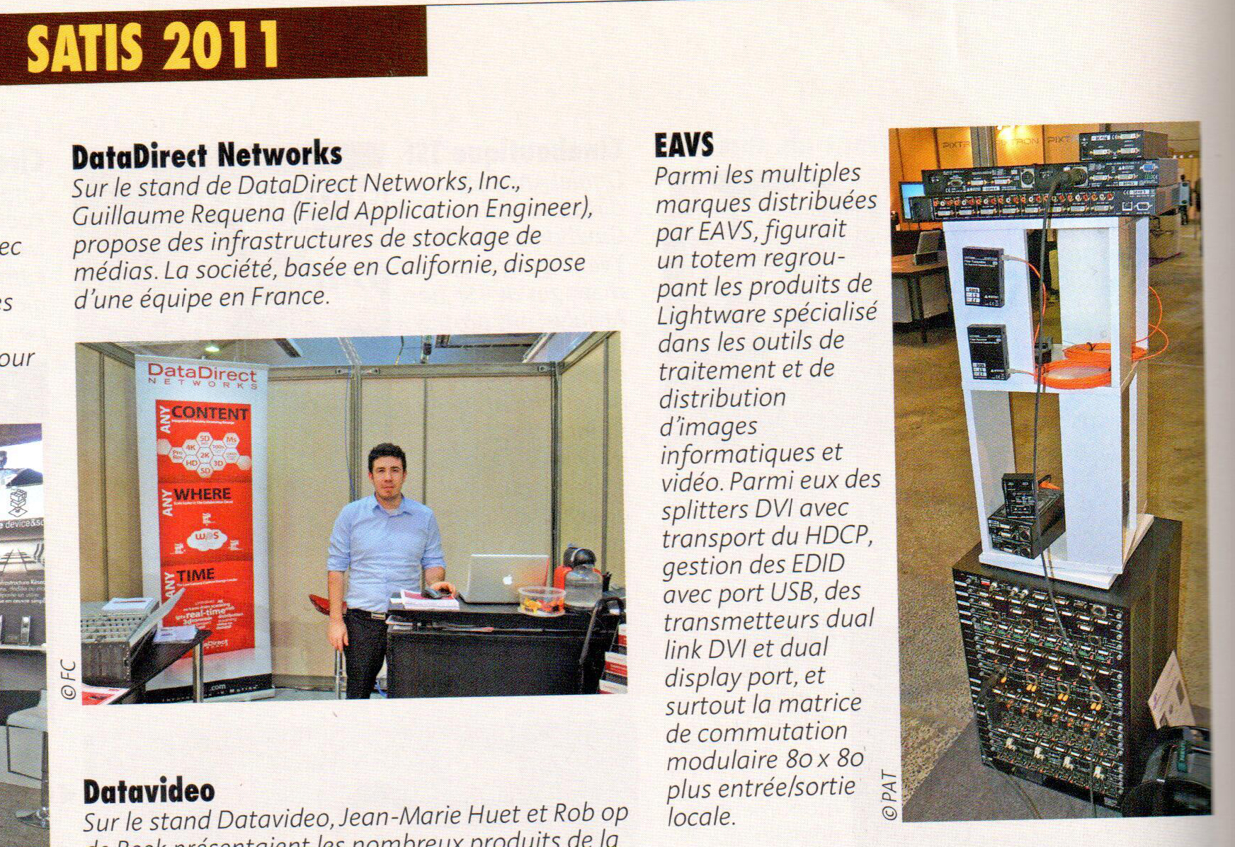 « Parmi les multiples marques distribuées par EAVS, figurait un totem regroupant les produits de Lightware spécialisé dans les outils de traitement et de distribution d’images informatiques et vidéo. Parmi eux des splitters DVI avec transport du HDCP, gestion des EDID avec port USB, des transmetteurs dual link DVI et dual display port, et surtout la matrice de commutation modulaire 80×80 plus entrée/sortir locale. » SONOVISION décembre 2011 n°568-page 54