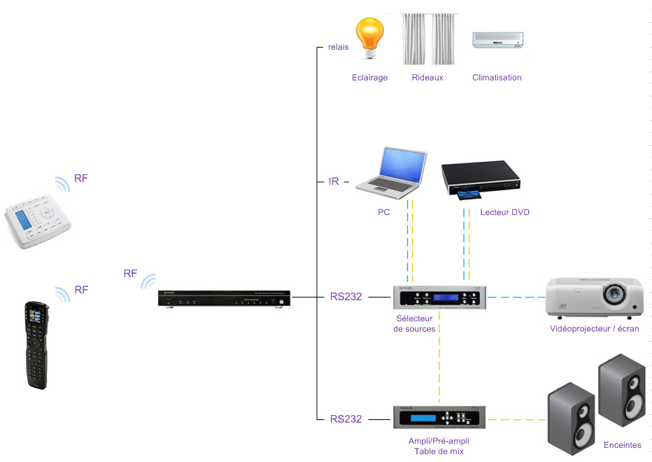 C’est une solution un peu plus évoluée, mais ne nécessitant pas de réseau informatique. Un contrôleur à réception RF, le URC MSC-400, possède tous les ports en sortie pour piloter les différents éléments : infrarouge, RS232 et relais.