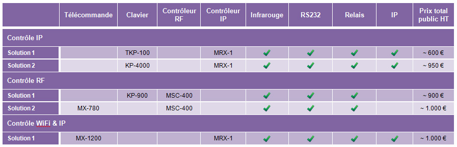 Avec différents modes de pilotages et différents protocoles, il y aura toujours la solution adaptée aux contraintes. Le tableau ci dessous résume les différentes solutions en donnant un ordre de tarif public pour les produits URC.